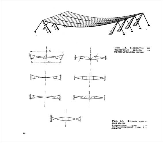 При устройстве предварительно-напряженных висячих покрытий одинарной кривизны ванты выполняют из круглой стали и размещают в ребрах, собираемых из отдельных железобетонных элементов; в этом случае плиты укладывают непосредственно по ребрам (рис. 20, в).