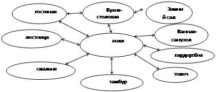 Здание двухэтажное с высотой этажа 3 м. На первом этаже расположены: тамбур, кухня - столовая, зимний сад, холл, спальная, гостиная, гардеробная, топочная, ванная-санузел.