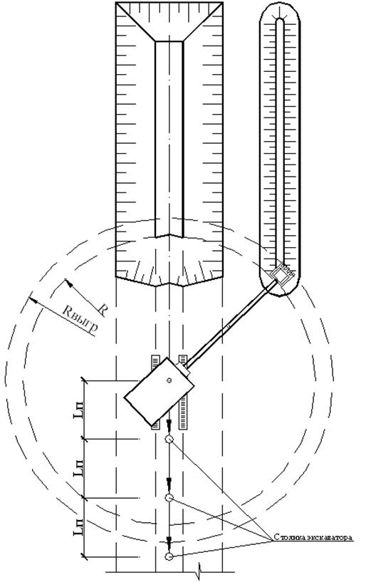 Движение экскаватора, при разработке траншей выполняется по оси с торцевой проходкой, следовательно, расстояние от оси хода экскаватора до кавальера должно быть не менее радиуса выгрузки экскаватора (Rвыгр). Для экскаватора ЭО – 4112А радиус выгрузки равен 10 м [4].